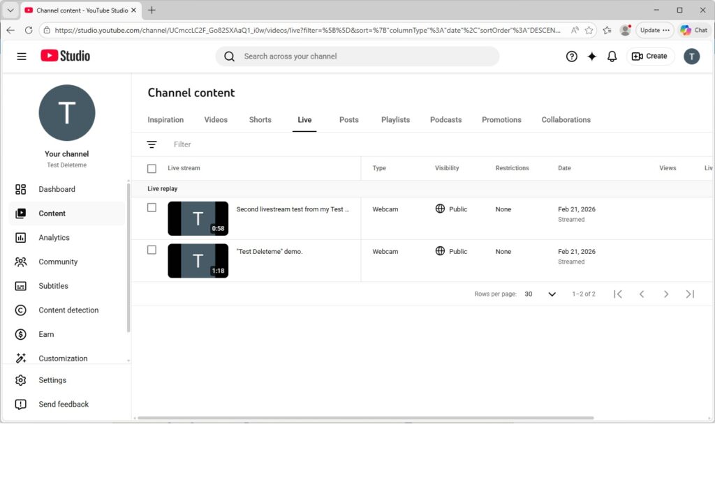 Embeds from my Test Deleteme channel don't work yet. YouTube says it takes a day or so to grant embedding permissions. I went through the process on Feb. 21, 2026. So for now, here is the link. It will open in a new tab. https://youtube.com/live/voYyo96Hp8A