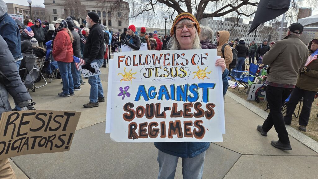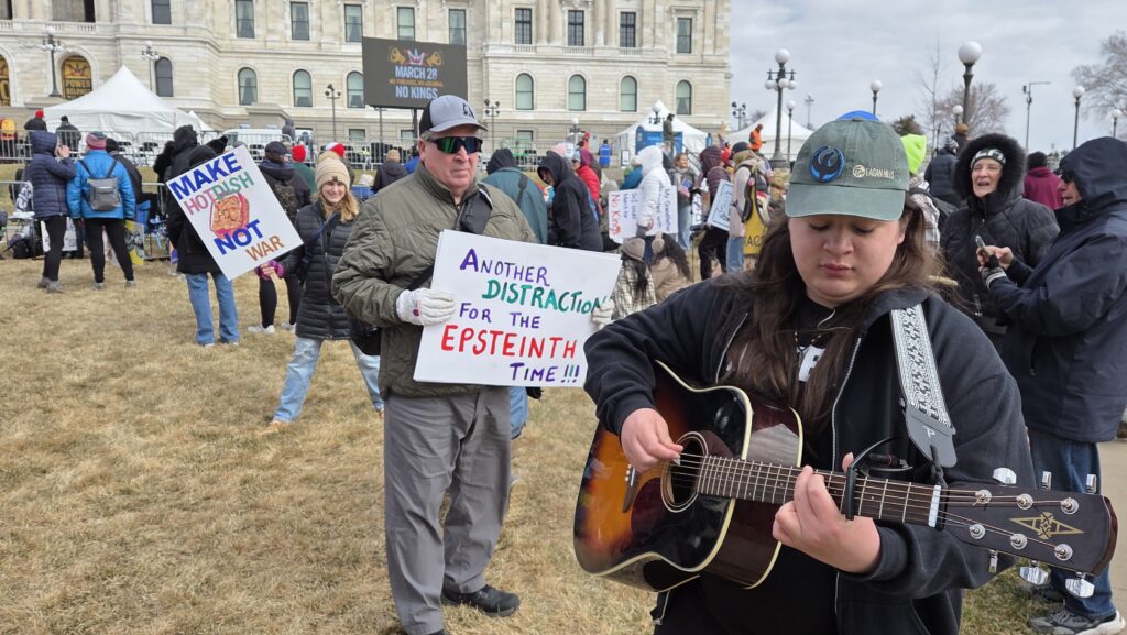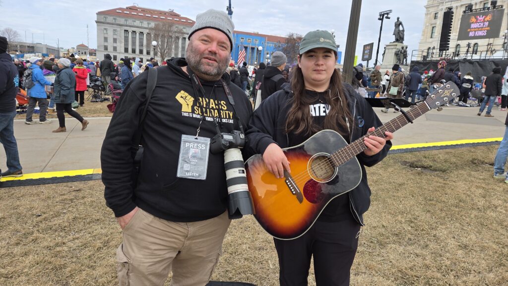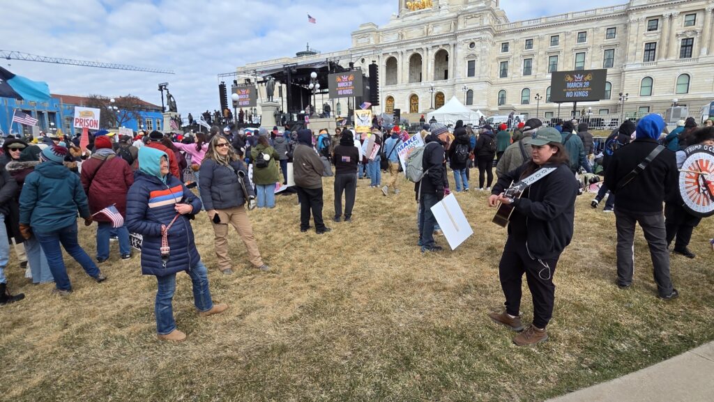 This time, because ICE and DHS agents tried to terrorize Minnesota this winter, the national No Kings rally sponsors called St. Paul the flagship event. National celebrities like Bruce Springsteen, Bernie Sanders, Jane Fonda, and Joan Baez flew here to talk to us. Everyone expected a bigger crowd than earlier events.