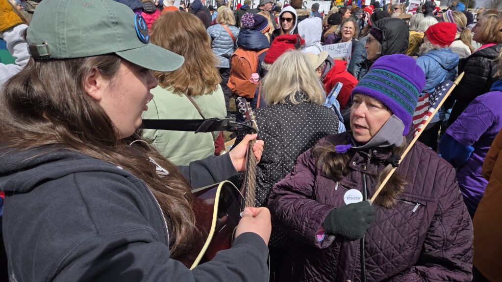 Zeke brought his guitar. He attracted an audience. I livestreamed some of it. The cell phone signal behaved badly for "This Land is Your Land," probably because thousands of other phones competed for the available cellular bandwidth. Now, I wish I would have recorded it instead of trying to livestream it.